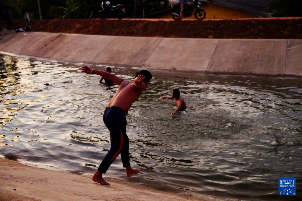 8月9日,當?shù)孛癖娫?7公里水渠中嬉戲。新華社記者 伍岳 攝