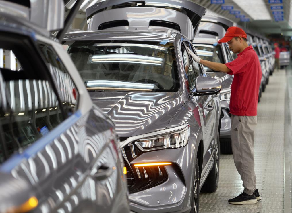 2024年4月24日,工人在位于河南省鄭州市的鄭州航空港區(qū)比亞迪總裝工廠新能源汽車“宋Pro”生產(chǎn)線上對車輛進(jìn)行質(zhì)檢。新華社記者李嘉南攝