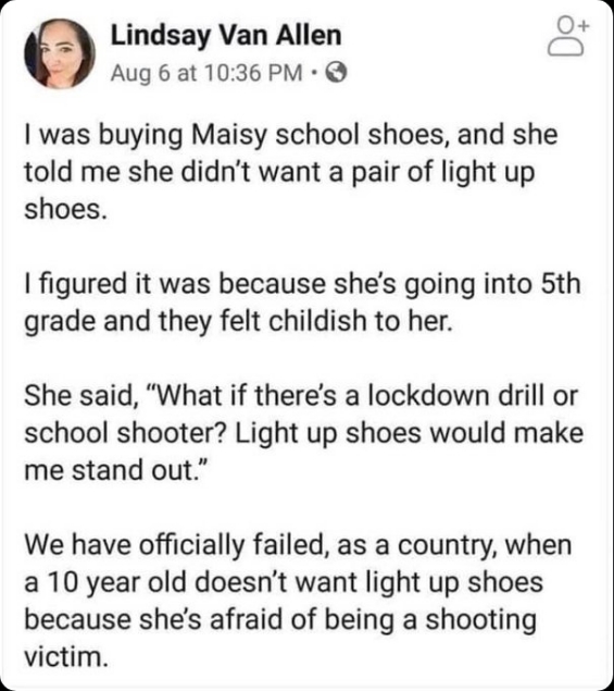 然而,梅茜這樣做的真實(shí)原因卻令人十分痛心。林賽寫道:“她說‘如果進(jìn)行封鎖演習(xí)或者發(fā)生校園槍擊事件怎么辦?發(fā)光的鞋子會(huì)讓我更引起注意?!边@個(gè)孩子非常擔(dān)心發(fā)生校園槍擊事件,以致于她不得不放棄每個(gè)孩子都想要的LED發(fā)光鞋。