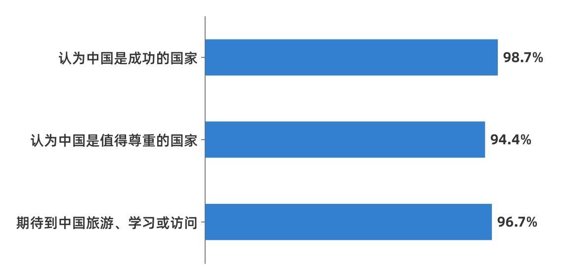 調(diào)查發(fā)現(xiàn),受訪青年普遍有極高的對華好感度。在對華總體印象的系列認知中,高達98.7%的受訪青年認為中國是一個成功的國家;94.4%的受訪青年認為中國是一個值得尊重的國家;96.7%的受訪青年期待未來有機會來到中國旅游、學習或訪問。