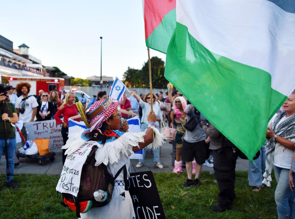 9月10日,示威者在美國(guó)費(fèi)城舉行電視辯論的國(guó)家憲法中心附近抗議。新華社記者李睿攝
