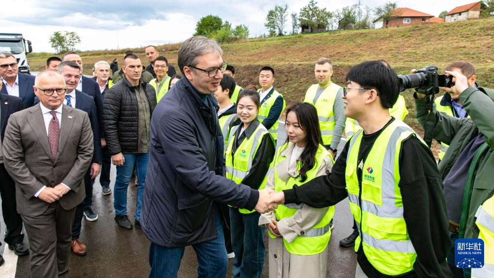 10月4日,在塞爾維亞中部城市上米拉諾瓦茨,塞爾維亞總統(tǒng)武契奇(中)在出席中企承建的繞城公路通車儀式時與項目建設者握手。新華社發(fā)(王韡攝)