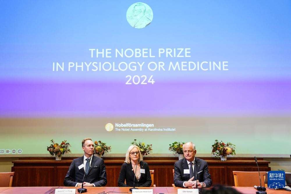 這是10月7日在瑞典斯德哥爾摩拍攝的2024年諾貝爾生理學(xué)或醫(yī)學(xué)獎公布現(xiàn)場。新華社記者 彭子洋 攝