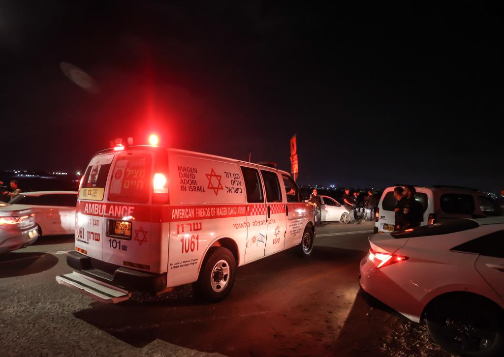 10月13日,在以色列北部賓亞米納,一輛救護(hù)車抵達(dá)遇襲軍事基地。新華社/基尼圖片社