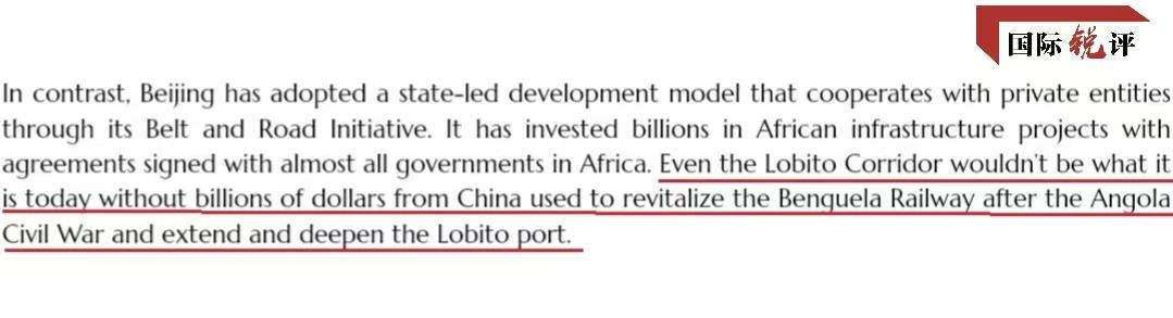 黎文濤認(rèn)為,美國(guó)試圖把“洛比托走廊”包裝成美歐為非洲基建作出的貢獻(xiàn),完全不符合事實(shí)。因?yàn)樗暮诵墓羌苤袊?guó)早已搭好,中國(guó)才是名副其實(shí)的最大貢獻(xiàn)者?!奥灞韧凶呃取惫倬W(wǎng)上也有這樣一段話:“如果沒(méi)有中國(guó)投入數(shù)十億美元重建本格拉鐵路、擴(kuò)建洛比托港口,‘洛比托走廊’就沒(méi)有當(dāng)今的模樣。”