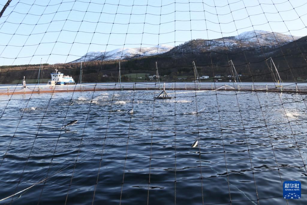 這張2023年10月10日拍攝的資料照片顯示的是位于挪威北部特羅姆斯郡峽灣中的三文魚養(yǎng)殖網(wǎng)箱。新華社記者 張玉亮 攝