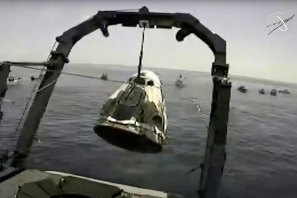 這張美國航天局2020年8月2日發(fā)布的視頻截圖顯示,回收船在美國東南部佛羅里達州附近的墨西哥灣打撈太空探索技術(shù)公司“龍”飛船。新華社發(fā)(美國航天局供圖)