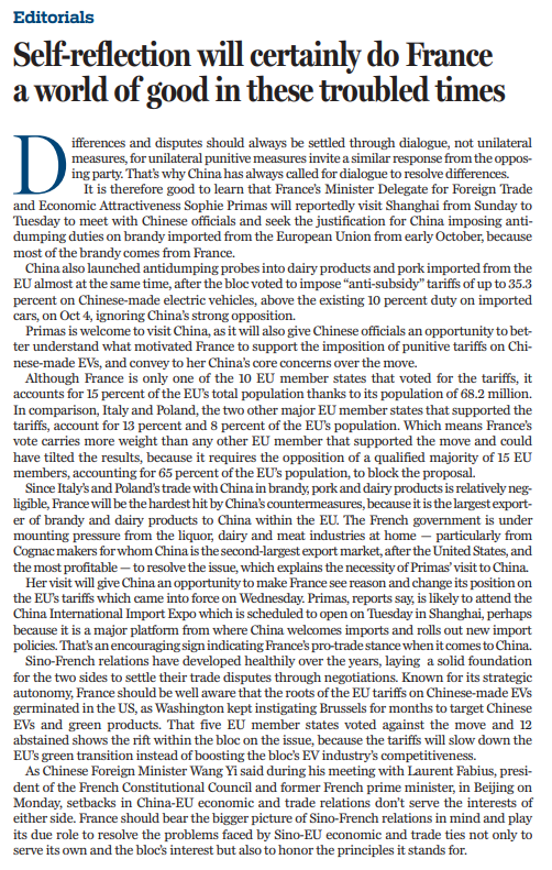 多年來,中法關(guān)系健康發(fā)展,為雙方通過談判解決貿(mào)易爭端奠定了堅(jiān)實(shí)基礎(chǔ)。以戰(zhàn)略自主著稱的法國應(yīng)該看到,幾個(gè)月以來,美國政府不斷煽動(dòng)歐盟委員會(huì)對中國電動(dòng)汽車和綠色產(chǎn)品采取行動(dòng),歐盟向中國電動(dòng)汽車加征關(guān)稅的風(fēng)波也由此開始。加征關(guān)稅非但不能壯大歐盟電動(dòng)汽車的競爭力,還會(huì)減緩其綠色轉(zhuǎn)型。表決過程中,5個(gè)成員國投票反對,12個(gè)成員國棄權(quán),也說明在對中國電動(dòng)汽車加征關(guān)稅的問題上,歐盟內(nèi)部存在著分歧。