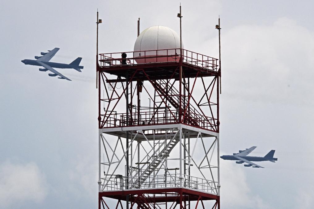 2024年2月22日,兩架美國空軍B-52轟炸機(jī)在新加坡航展上做飛行表演。新華社發(fā)(鄧智煒攝)