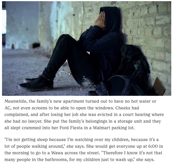 在弗吉尼亞州生活的奇克斯是一位獨(dú)自撫養(yǎng)四個(gè)孩子的母親。由于失業(yè)后無(wú)力負(fù)擔(dān)房租,她和四個(gè)孩子的臨時(shí)住房是一輛小轎車(chē),這輛車(chē)長(zhǎng)期停在一家超市的停車(chē)場(chǎng)里。