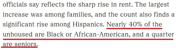 根據(jù)美國(guó)全國(guó)公共廣播電臺(tái)2023年報(bào)道中提及的數(shù)據(jù),近40%的無(wú)家可歸者是非洲裔美國(guó)人,25%的無(wú)家可歸者是老年人,而拉丁裔無(wú)家可歸者的增幅則在近年大幅提升。