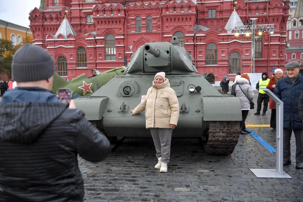 11月7日,在俄羅斯首都莫斯科,一名女子在以紀(jì)念1941年蘇聯(lián)紅場(chǎng)閱兵式為主題的露天展覽上留影。新華社發(fā)(亞歷山大攝)