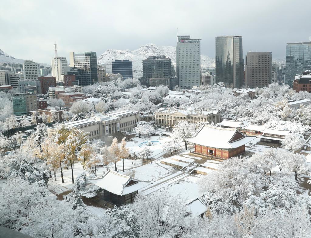 這是11月27日拍攝的韓國(guó)首都首爾市中心的雪景。新華社記者姚琪琳攝