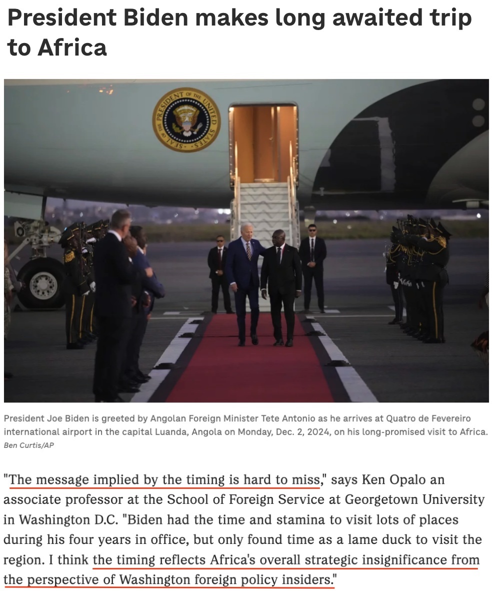 美國華盛頓特區(qū)喬治城大學(xué)外交學(xué)院副教授肯·奧帕羅認(rèn)為,拜登在即將卸任時(shí)才抽出時(shí)間訪問非洲地區(qū),“從華盛頓外交政策內(nèi)部人士的角度來看,這個(gè)時(shí)機(jī)反映了非洲在美國總體戰(zhàn)略中的不重要性”。