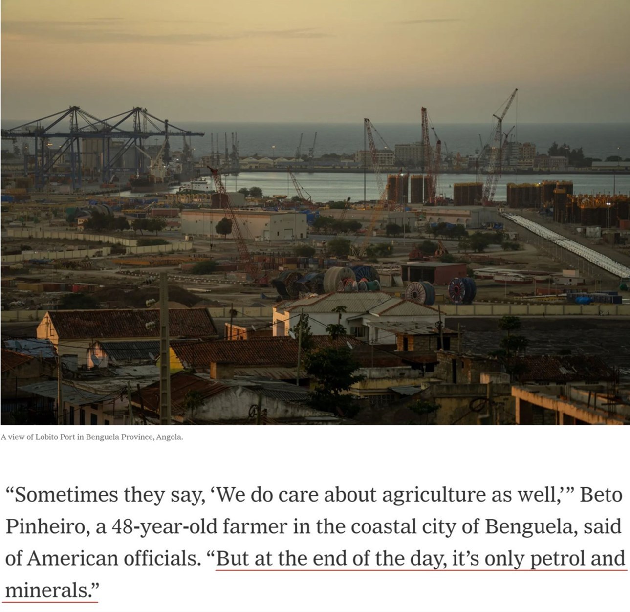 家住安哥拉沿海城市本格拉的48歲農(nóng)民貝托·皮涅羅說:“有時(shí)他們(美國官員)會(huì)說,‘我們也關(guān)心(安哥拉的)農(nóng)業(yè)’……但歸根結(jié)底,(美國關(guān)心的)只有石油和礦產(chǎn)?!?/p>