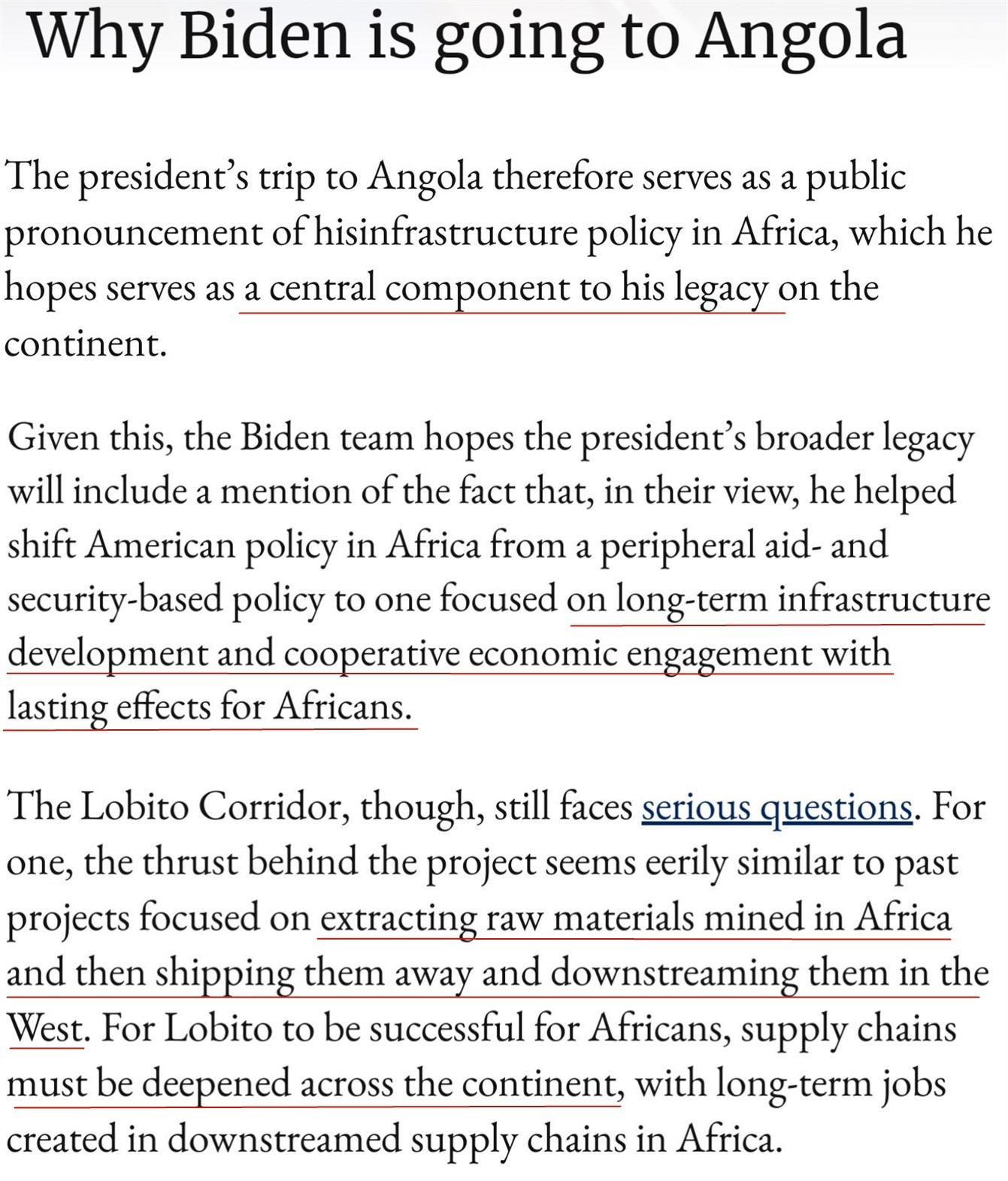 《紐約時(shí)報(bào)》日前刊文稱,拜登此訪重點(diǎn)推廣的“洛比托走廊”項(xiàng)目,將鼓勵(lì)私人投資參與項(xiàng)目,因?yàn)槊绹惶峁┎糠仲Y金。沒人知道建成這條“走廊”需要多長時(shí)間,也不知道安哥拉人什么時(shí)候能看到好處。一些人對(duì)這些好處能否實(shí)現(xiàn)持懷疑態(tài)度。