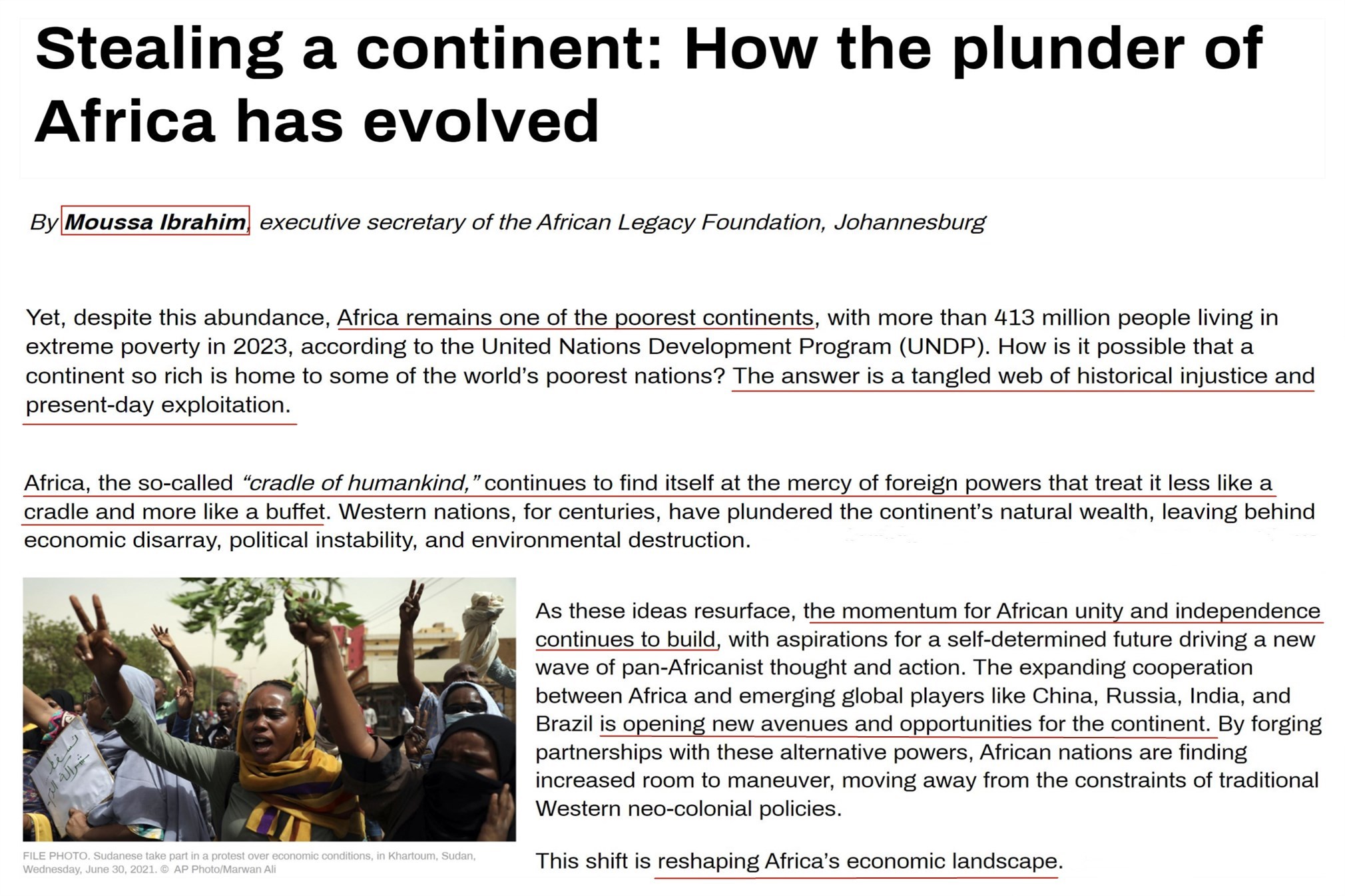 非洲遺產(chǎn)基金會(huì)執(zhí)行秘書穆薩·易卜拉欣發(fā)文指出,盡管非洲自然資源豐富,但仍是最貧窮的大陸。時(shí)至今日,非洲這個(gè)人類搖籃仍受到外國列強(qiáng)的擺布,西方對(duì)非洲自然資源的劫掠只不過換了包裝。