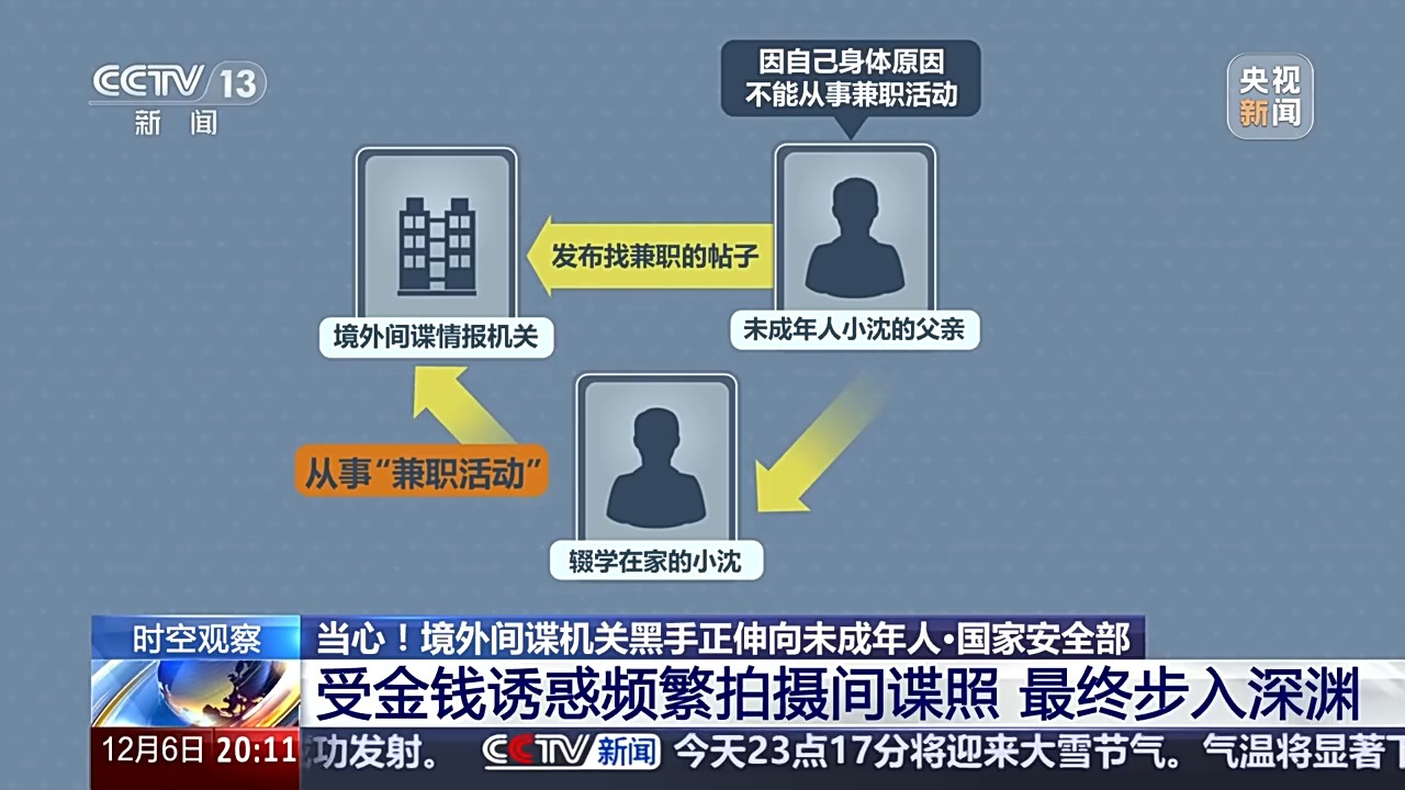 國(guó)際關(guān)系學(xué)院法學(xué)院教師 孔祥承:境外間諜機(jī)關(guān)目前都采取的是一種合法掩飾非法、公開掩護(hù)秘密的方式,對(duì)未成年人進(jìn)行一個(gè)拉攏策反。在多數(shù)情況下,他們會(huì)比如說(shuō)偽裝成知心大姐、知心哥哥的方式,然后去影響這些未成年人,因?yàn)橐恍┪闯赡耆送媸啦簧?,就被他們的甜言蜜語(yǔ)所誘惑,而逐漸被他們所利用??赡苓€有一些更為惡劣的情況,比如說(shuō)一旦一些未成年人意識(shí)到這是一個(gè)間諜行為,想及時(shí)收手,那么境外的間諜機(jī)關(guān)也會(huì)利用他之前的行為作為把柄威脅他,導(dǎo)致他不得不繼續(xù)從事相關(guān)的行為,受他們的擺布,成為一個(gè)傀儡。