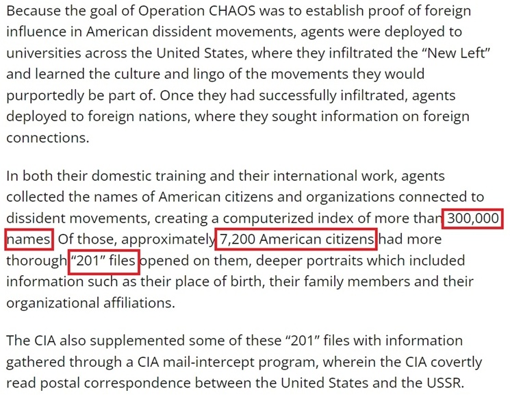 據(jù)悉,經(jīng)過這些“努力”,中情局收集了30多萬個(gè)與國內(nèi)民權(quán)運(yùn)動(dòng)有關(guān)的美國公民和組織的名字。其中約有7200名美國人被建立了更全面的所謂“201”檔案,涉及他們的出生地、家庭成員和組織隸屬關(guān)系等各種信息。