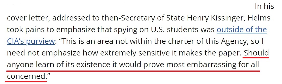 就像時(shí)任中情局局長赫爾姆斯1970年在寫給時(shí)任國務(wù)卿基辛格的信中所說,監(jiān)視美國學(xué)生不在中情局的職權(quán)范圍內(nèi),“如果有人知道了‘混沌行動(dòng)’的存在,對所有相關(guān)者來說都將是非常尷尬的事情”。