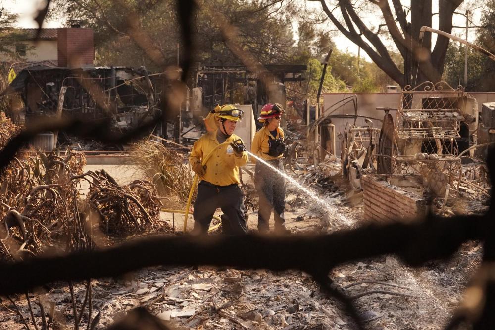 1月10日,在美國(guó)加利福尼亞州洛杉磯縣阿爾塔迪納地區(qū),消防員正在努力撲滅山火過(guò)后建筑周圍的熱點(diǎn)區(qū)域。新華社發(fā)(曾慧攝)
