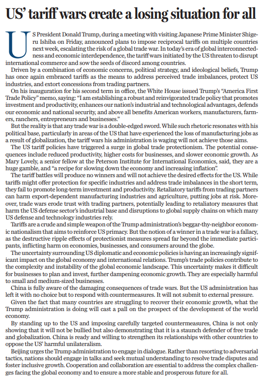 美國(guó)關(guān)稅政策令全球貿(mào)易保護(hù)主義高漲,或?qū)?dǎo)致生產(chǎn)效率下降、企業(yè)成本上升、經(jīng)濟(jì)增長(zhǎng)放緩等問題。正如美國(guó)彼得森國(guó)際經(jīng)濟(jì)研究所高級(jí)研究員瑪麗·洛夫利所說,這是一場(chǎng)豪賭,將“釀成經(jīng)濟(jì)放緩和通脹走高的惡果”。