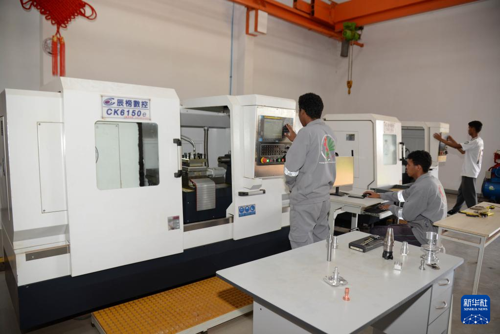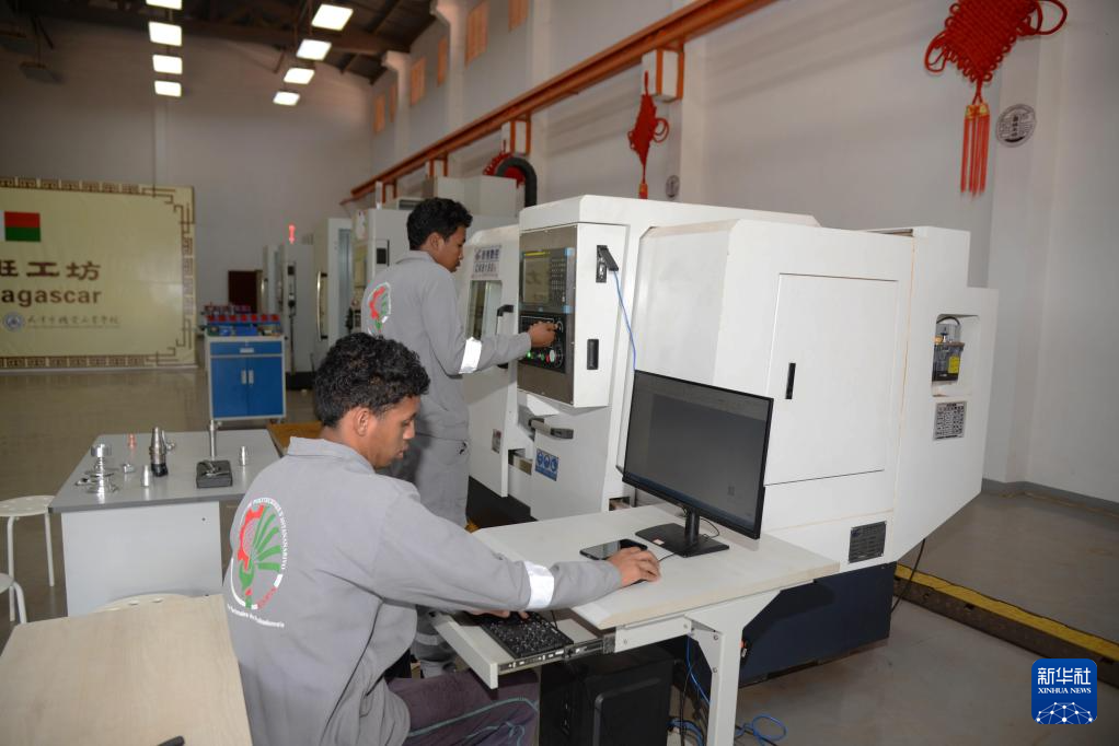 2月10日,在馬達(dá)加斯加首都塔那那利佛的魯班工坊,機(jī)械工程專業(yè)學(xué)生進(jìn)行數(shù)控機(jī)床的教學(xué)實踐。新華社發(fā)(西塔卡·拉喬納里松攝)