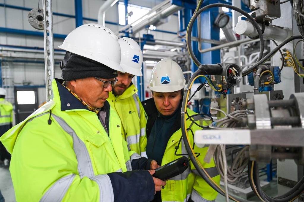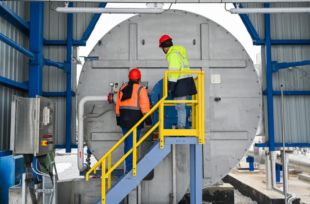 2月12日,中土兩國工程師在土耳其阿克薩拉伊省的圖茲湖地下天然氣儲庫擴建項目地面場站查看設備。新華社記者劉磊攝