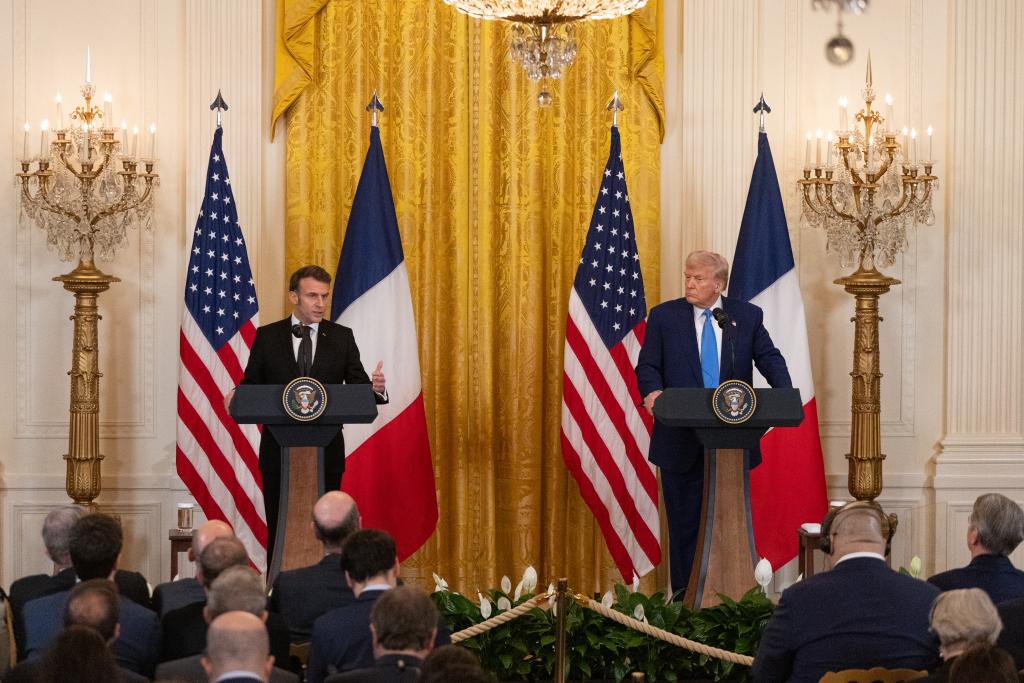 2月24日,美國總統(tǒng)特朗普(右)在華盛頓白宮與到訪的法國總統(tǒng)馬克龍舉行聯(lián)合記者會(huì)。新華社記者胡友松攝