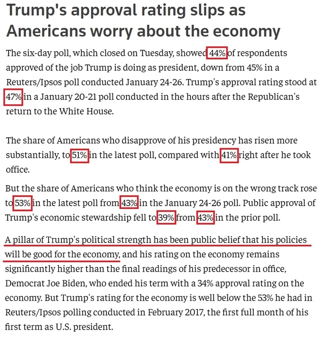 路透社在報道中指出,特朗普政治實力的一個支柱就是不少人相信他的政策對經(jīng)濟有利,而最新民調(diào)結(jié)果顯示,越來越多的美國人因為這位新總統(tǒng)威脅要對外加征關(guān)稅而對美國的經(jīng)濟發(fā)展方向感到擔憂。