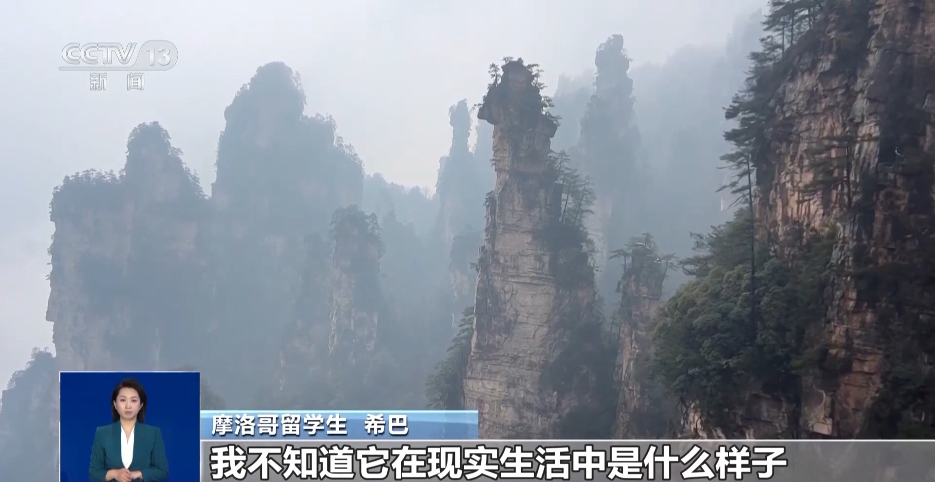 摩洛哥留學生 希巴:看完電影后我想去張家界,我不知道它在現(xiàn)實生活中是什么樣子,但它看起來就像天堂,整個水域,山脈,一切都非常棒,美麗。