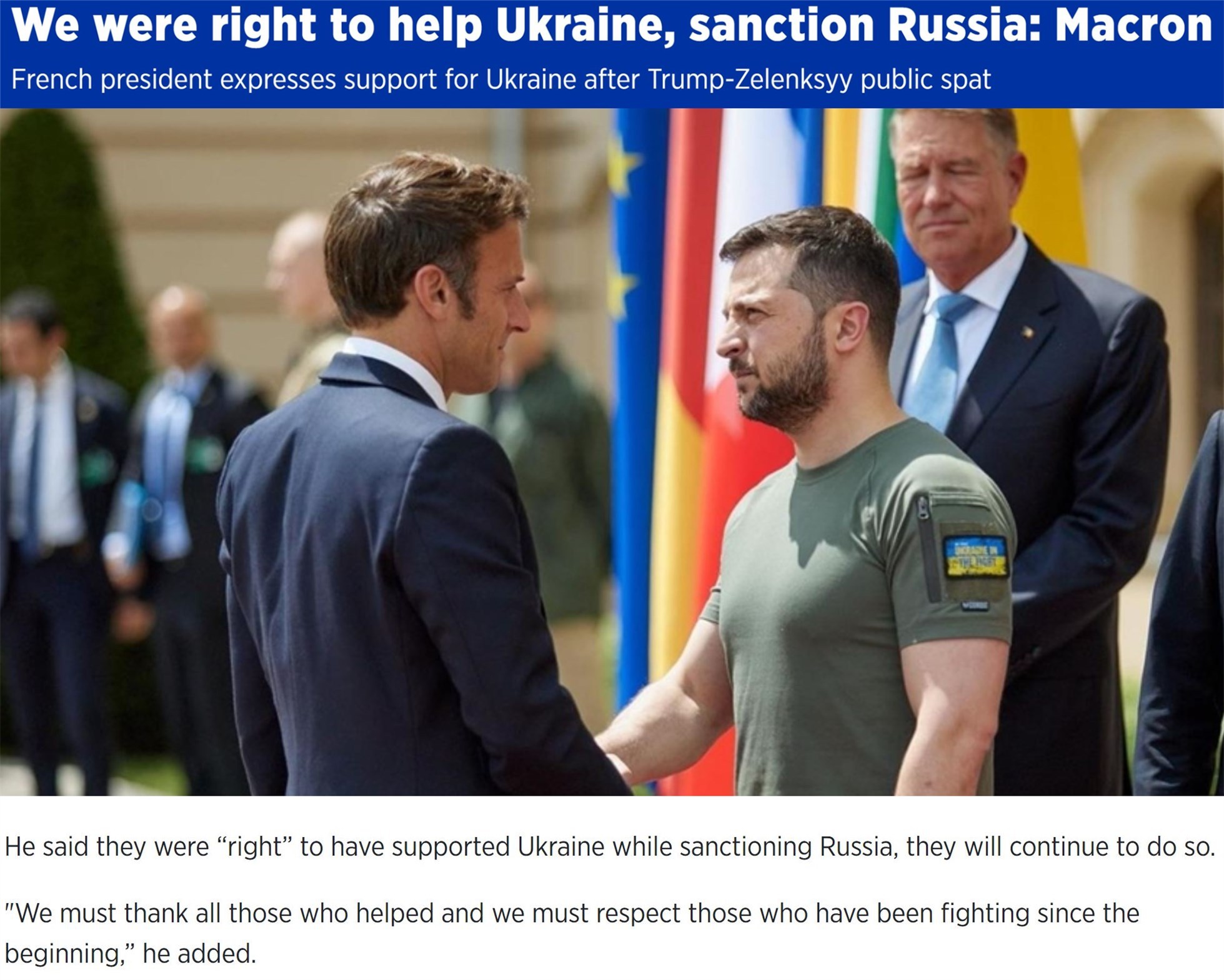 法國總統(tǒng)馬克龍?jiān)谂c澤連斯基通話后對媒體稱,西方支持烏克蘭是“正確”的,而且應(yīng)該繼續(xù)這樣做,因?yàn)椤澳切囊婚_始就在戰(zhàn)斗的人是在為歐洲的安全而戰(zhàn)”。