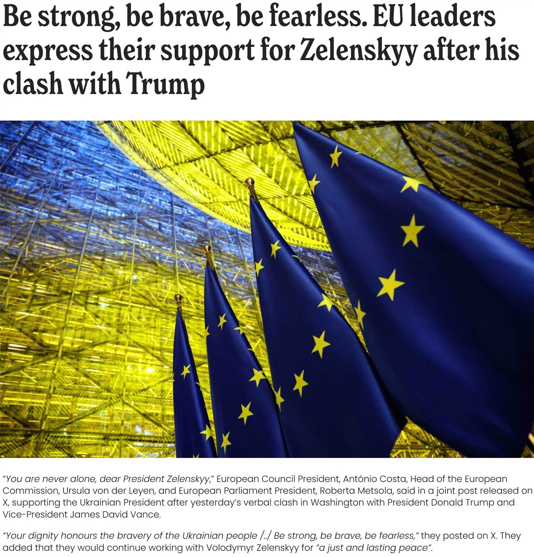 歐盟委員會主席馮德萊恩和歐洲理事會主席科斯塔在社交媒體上發(fā)表聯(lián)合聲明稱,歐盟將繼續(xù)與烏克蘭共同努力,力爭實(shí)現(xiàn)持久和平。