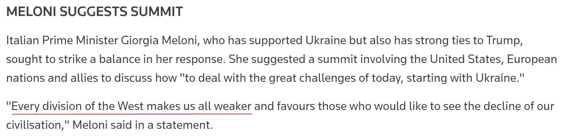 “西方的每一次分裂都使我們變得更加虛弱,并有利于那些希望看到我們文明衰落的人。分裂對誰都沒有好處?,F(xiàn)在需要的是美國、歐洲國家和盟友之間立即舉行峰會,坦率地討論我們打算如何應(yīng)對今天的巨大挑戰(zhàn),從烏克蘭問題開始?!?/p>