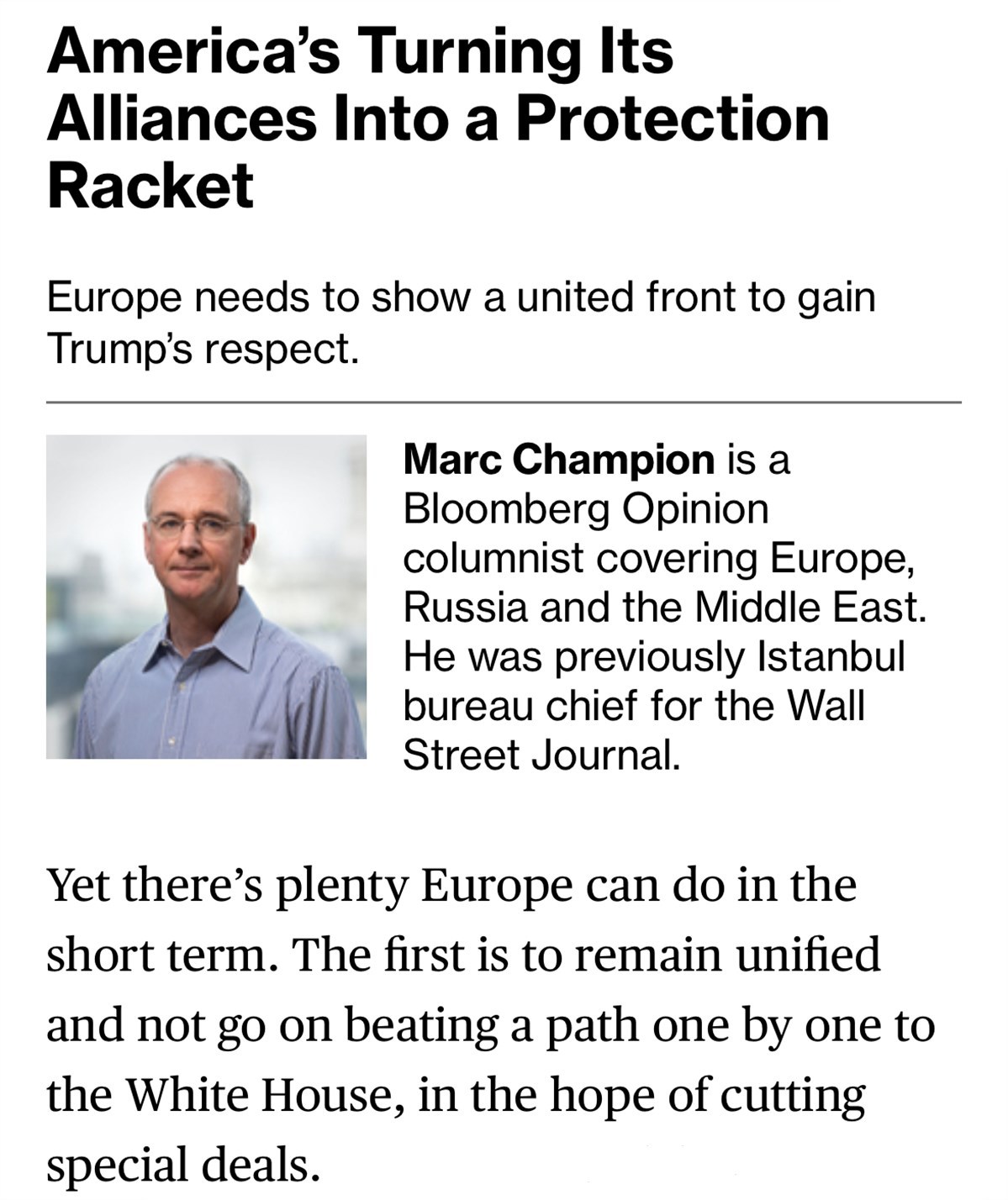 在彭博社專欄作家馬克·錢皮恩看來,特朗普政府奉行的“美國優(yōu)先”政策導(dǎo)致跨大西洋關(guān)系裂痕不斷加深。歐洲領(lǐng)導(dǎo)人應(yīng)保持團(tuán)結(jié),而不是一個(gè)接一個(gè)前往白宮,希望與美達(dá)成特殊協(xié)議。