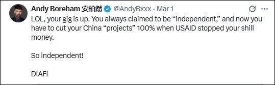 “笑死,你們?nèi)嗽O(shè)崩了?!痹谥袊?guó)生活和工作多年的新西蘭媒體人安迪·博勒姆(中文名安柏然)也嘲諷道,“成天標(biāo)榜自己‘獨(dú)立’,現(xiàn)在美國(guó)國(guó)際開(kāi)發(fā)署斷了黑錢(qián),對(duì)華‘項(xiàng)目’得100%砍光。還真是獨(dú)立啊!趕緊涼透吧!”