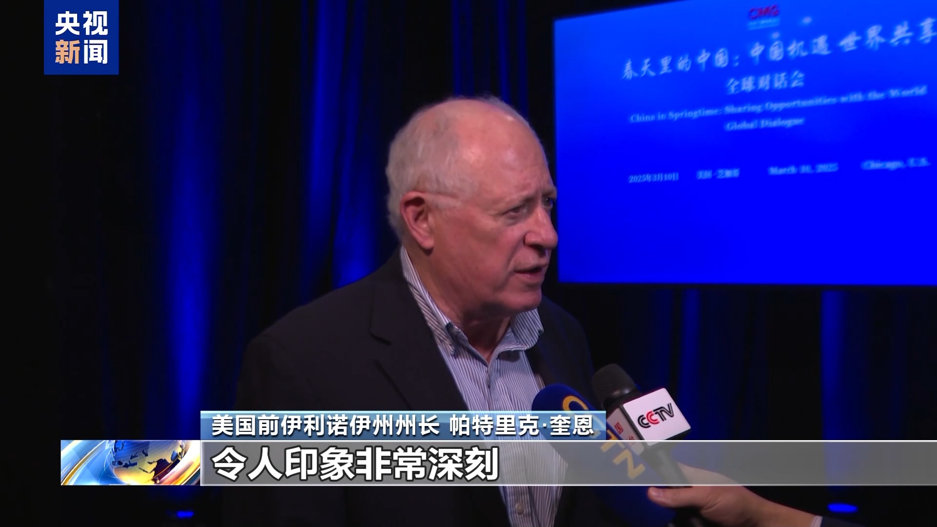 美國前伊利諾伊州州長 帕特里克·奎恩:中國在一些領(lǐng)域的創(chuàng)新發(fā)展令人印象非常深刻,特別是太陽能、風(fēng)能、綠色能源儲備和效率方面。