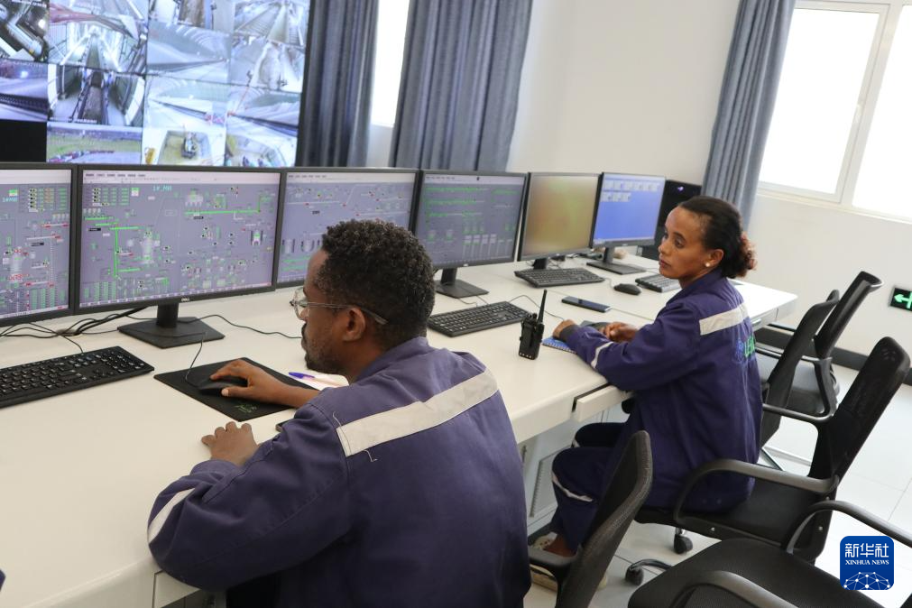 3月5日,當(dāng)?shù)貑T工在埃塞俄比亞萊米國家水泥廠的中控室工作。新華社記者 劉方強 攝