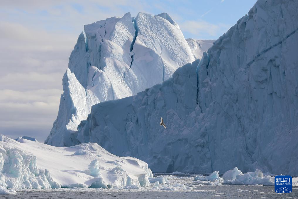 3月22日,在丹麥自治領(lǐng)地格陵蘭島迪斯科灣,一只海鳥從冰山旁飛過。新華社記者 趙丁喆 攝