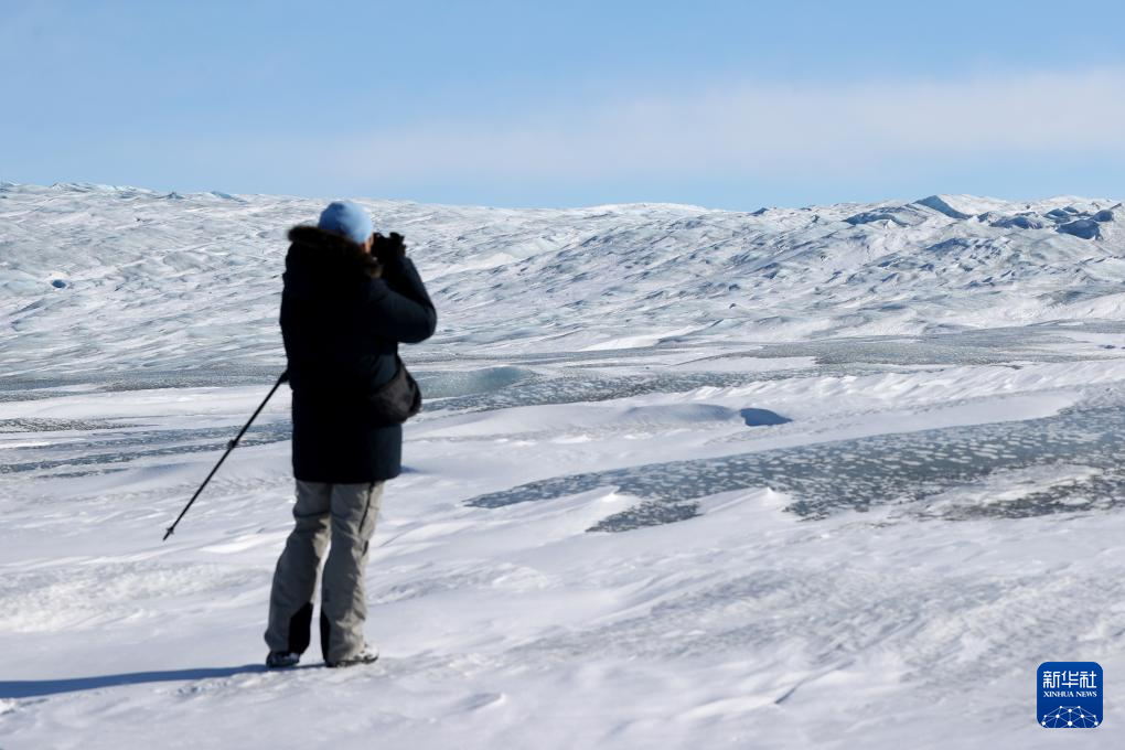 3月21日,在丹麥自治領(lǐng)地格陵蘭島中部的南斯特倫菲尤爾附近,一名男子在拍攝冰蓋。新華社記者 趙丁喆 攝