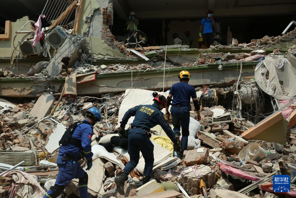3月30日,在緬甸曼德勒天空別墅公寓建筑群,救援隊及志愿者一起開展救援活動。新華社發(fā)(苗覺梭攝)