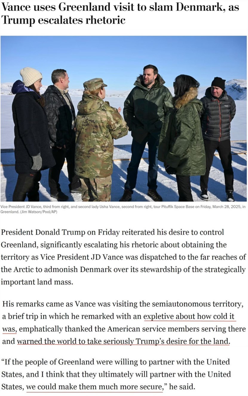 在萬(wàn)斯一行登島當(dāng)天剛剛成立的格陵蘭島新一屆自治政府直言,美方此行對(duì)格陵蘭島人民“缺乏尊重”,格陵蘭島不想成為美國(guó)的一部分。
