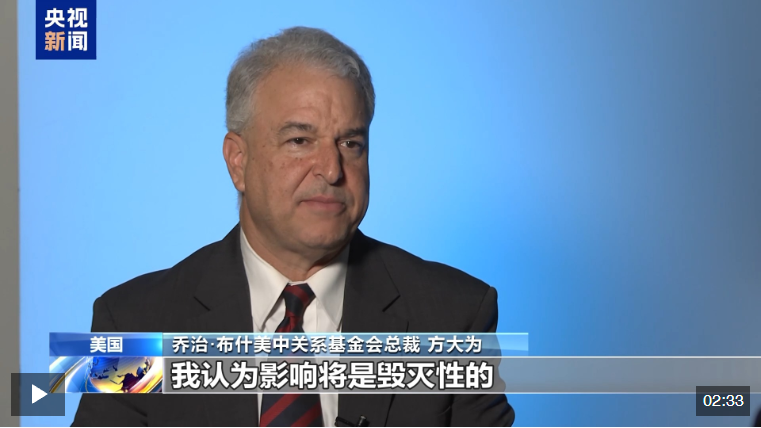 喬治·布什美中關(guān)系基金會(huì)總裁方大為6日在接受央視記者專訪時(shí)表示,美國(guó)政府新關(guān)稅政策的影響將是毀滅性的,不僅會(huì)使美國(guó)經(jīng)濟(jì)面臨更大的風(fēng)險(xiǎn),引發(fā)的經(jīng)濟(jì)衰退更是對(duì)全球貿(mào)易體系的破壞。