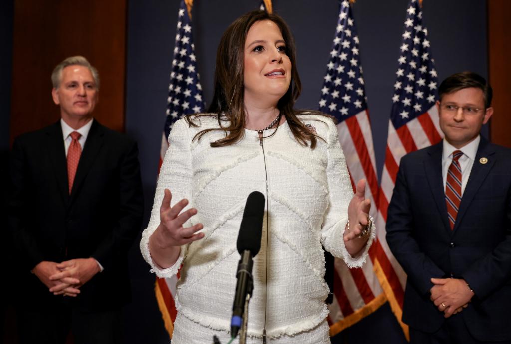 2021年5月14日,美國(guó)紐約州共和黨籍聯(lián)邦眾議員愛(ài)麗絲·斯蒂芬尼克在華盛頓國(guó)會(huì)山向記者講話。新華社/路透