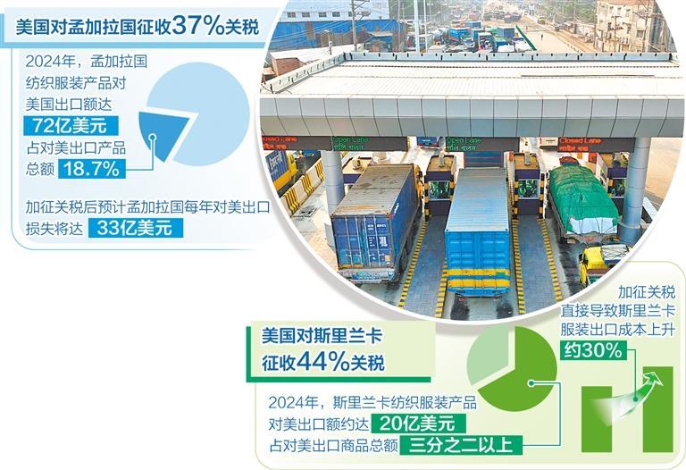 孟加拉國經(jīng)濟(jì)高度依賴紡織服裝產(chǎn)品出口,美國是孟加拉國除歐盟外的第二大出口市場。作為全球第二大服裝產(chǎn)品出口國,2024年,孟加拉國紡織服裝產(chǎn)品對美國出口額達(dá)到72億美元,占對美出口產(chǎn)品總額的18.7%。美國所謂“對等關(guān)稅”生效后,直接沖擊孟加拉國紡織服裝出口領(lǐng)域,使出口成本大幅增加,嚴(yán)重削弱了孟加拉國產(chǎn)品的價格競爭力。在此背景下,預(yù)計孟加拉國每年對美出口損失將達(dá)到33億美元。此外,近期印度政府宣布不再允許孟加拉國經(jīng)印度陸地海關(guān)對第三國出口貨物,此舉將在短期內(nèi)進(jìn)一步推高孟加拉國貨物出口成本。
