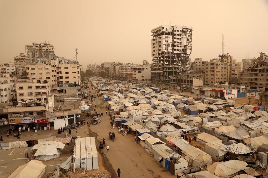 這是4月30日在加沙城拍攝的沙塵天氣下的流離失所者聚集區(qū)。新華社發(fā)(里澤克·阿卜杜勒賈瓦德攝)