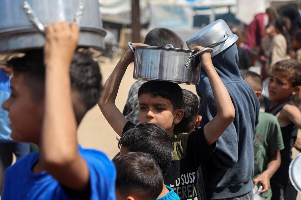 5月2日,孩子們在加沙城等待領(lǐng)取救助食物。新華社發(fā)(里澤克·阿卜杜勒賈瓦德攝)