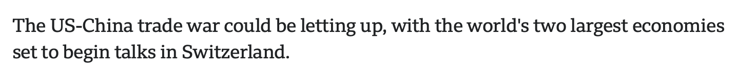 英國廣播公司的報道稱,隨著世界兩大經(jīng)濟(jì)體即將在瑞士開始會談,中美貿(mào)易戰(zhàn)可能正在緩和。