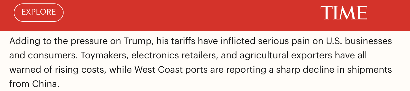 報道同時指出,美國政府的關(guān)稅措施給美國企業(yè)和消費者帶來了沉重打擊,這進(jìn)一步加劇了美國政府的壓力。玩具制造商、電子產(chǎn)品零售商和農(nóng)產(chǎn)品出口商都警告稱,成本將上升,而美國西海岸的港口則報告稱,來自中國的貨運量急劇下降。
