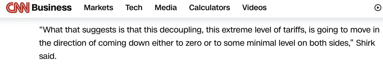 美國有線電視新聞網(wǎng)的報道注意到美國財政部長貝森特此前關(guān)于“本周末的談判將側(cè)重于緩和緊張局勢”的表態(tài)。報道援引加州大學(xué)圣迭戈分校全球政策與戰(zhàn)略學(xué)院研究教授、21世紀(jì)中國研究中心名譽主任蘇珊·希爾克的觀點指出,這表明美中之間“脫鉤、極端的關(guān)稅水平,將朝著降至零,或是降至最低水平的方向發(fā)展”。